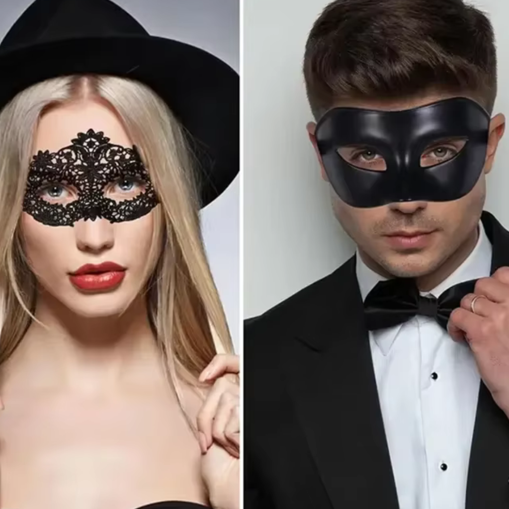 These elegant masquerade masks are designed to create a striking, mysterious look. The men’s (or women’s) mask features a sleek black faux-leather finish, while the women’s mask is embellished with delicate floral lace for a glamourous look. The contrasting designs complement each other beautifully, making them an ideal choice for couples seeking a coordinated yet distinctive look.