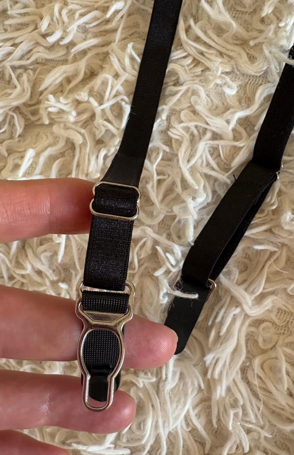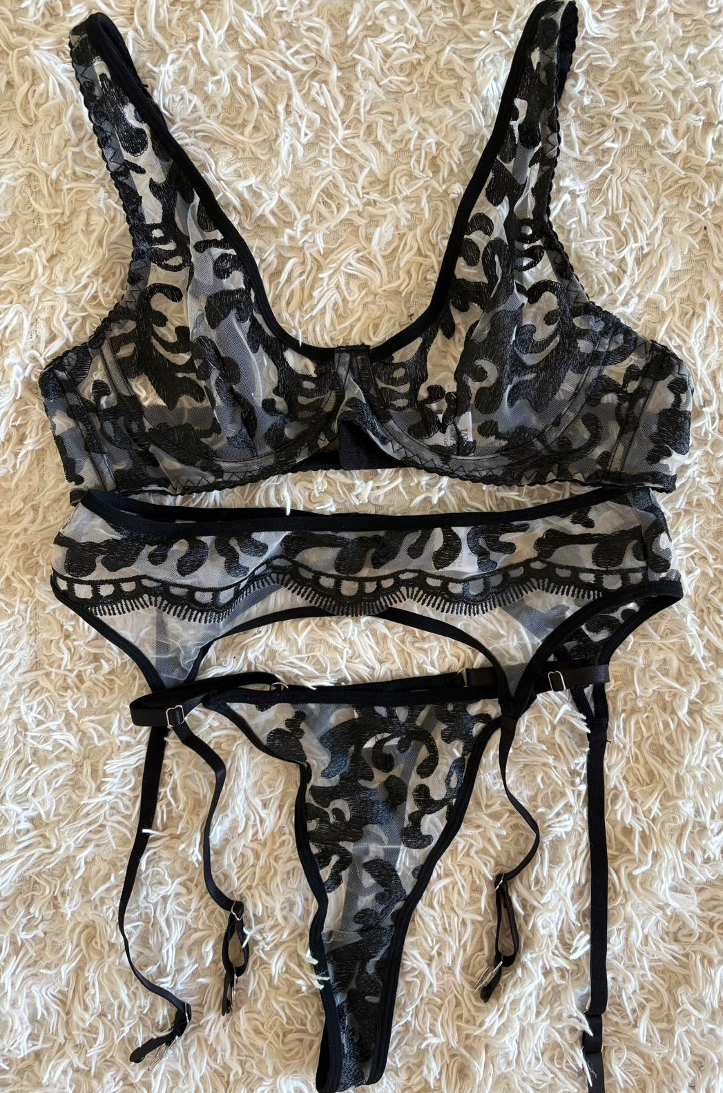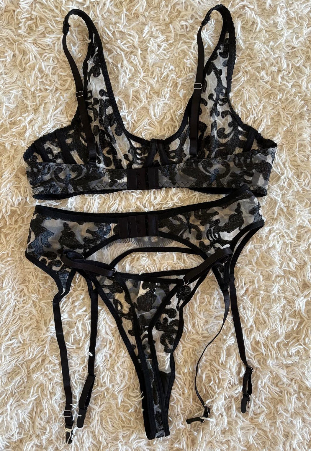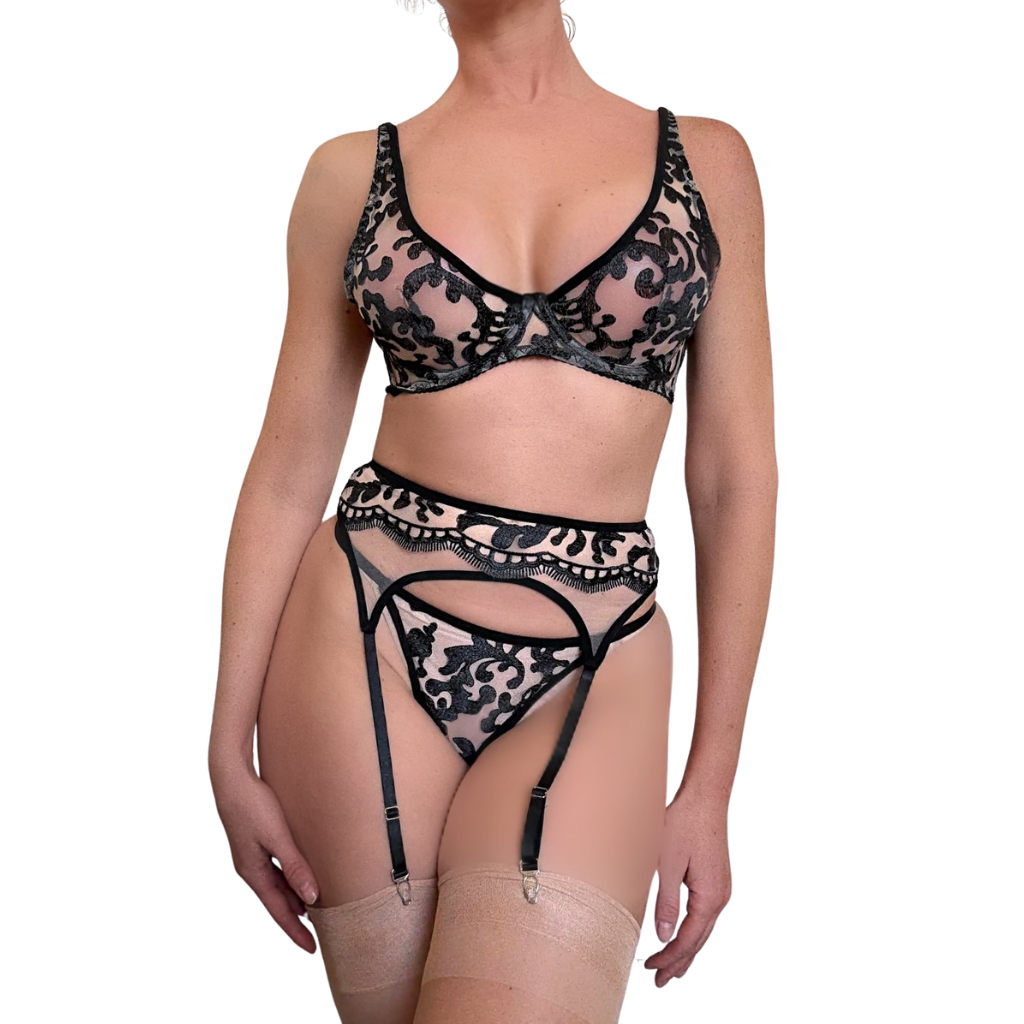 Captivating black embroidery on sheer mesh garter set featuring underwire cups, wide and comfortable adjustable bra straps, 4 adjustable leg straps with durable metal clips, & a G-string panty with adjustable waist straps.