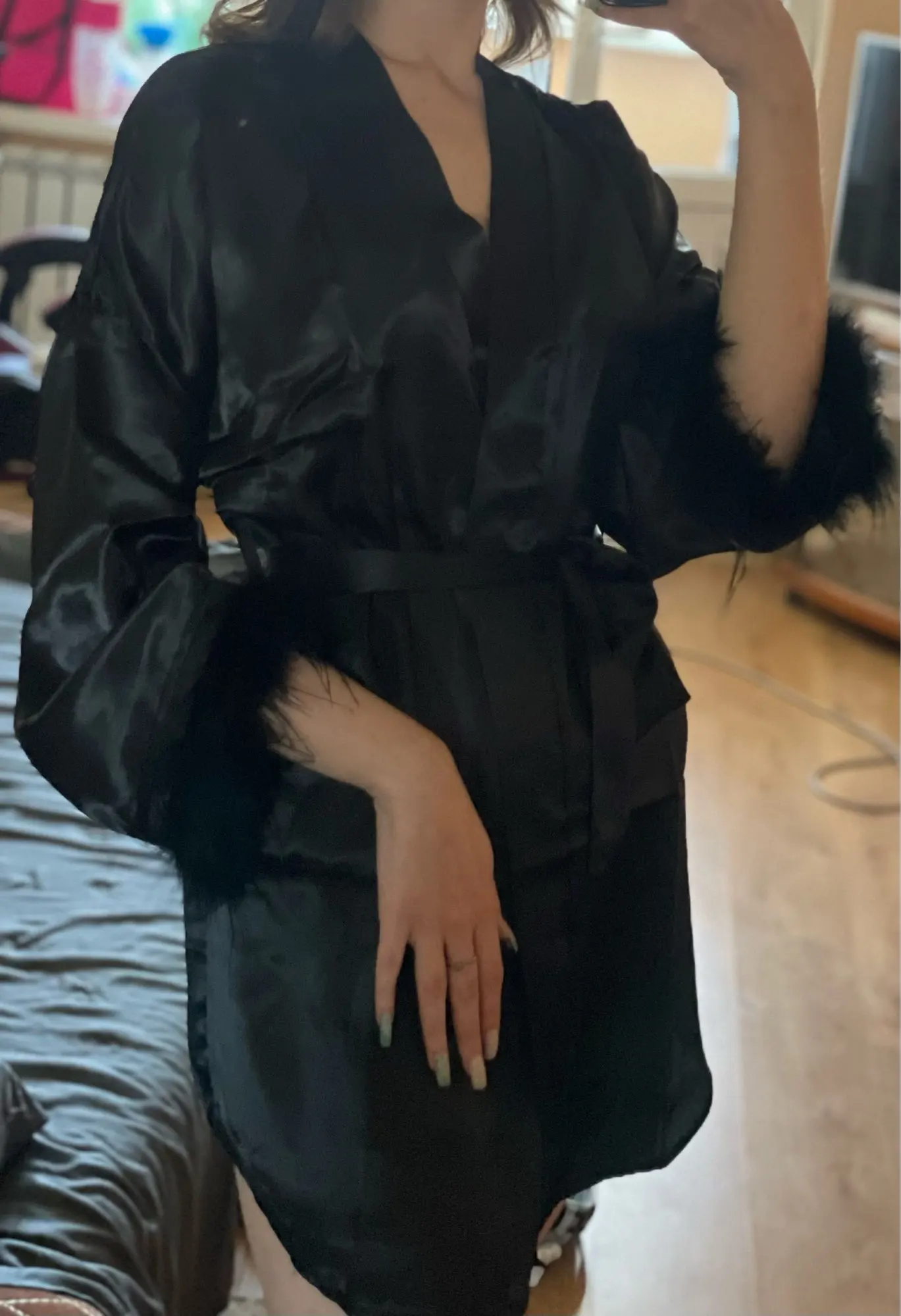 Lounge like a queen in this beautiful silk-like robe with stylish feather trim long sleeves. Luxurious, breathably soft, with a sexy above knee cut. Perfect for home daily sleepwear/loungewear.