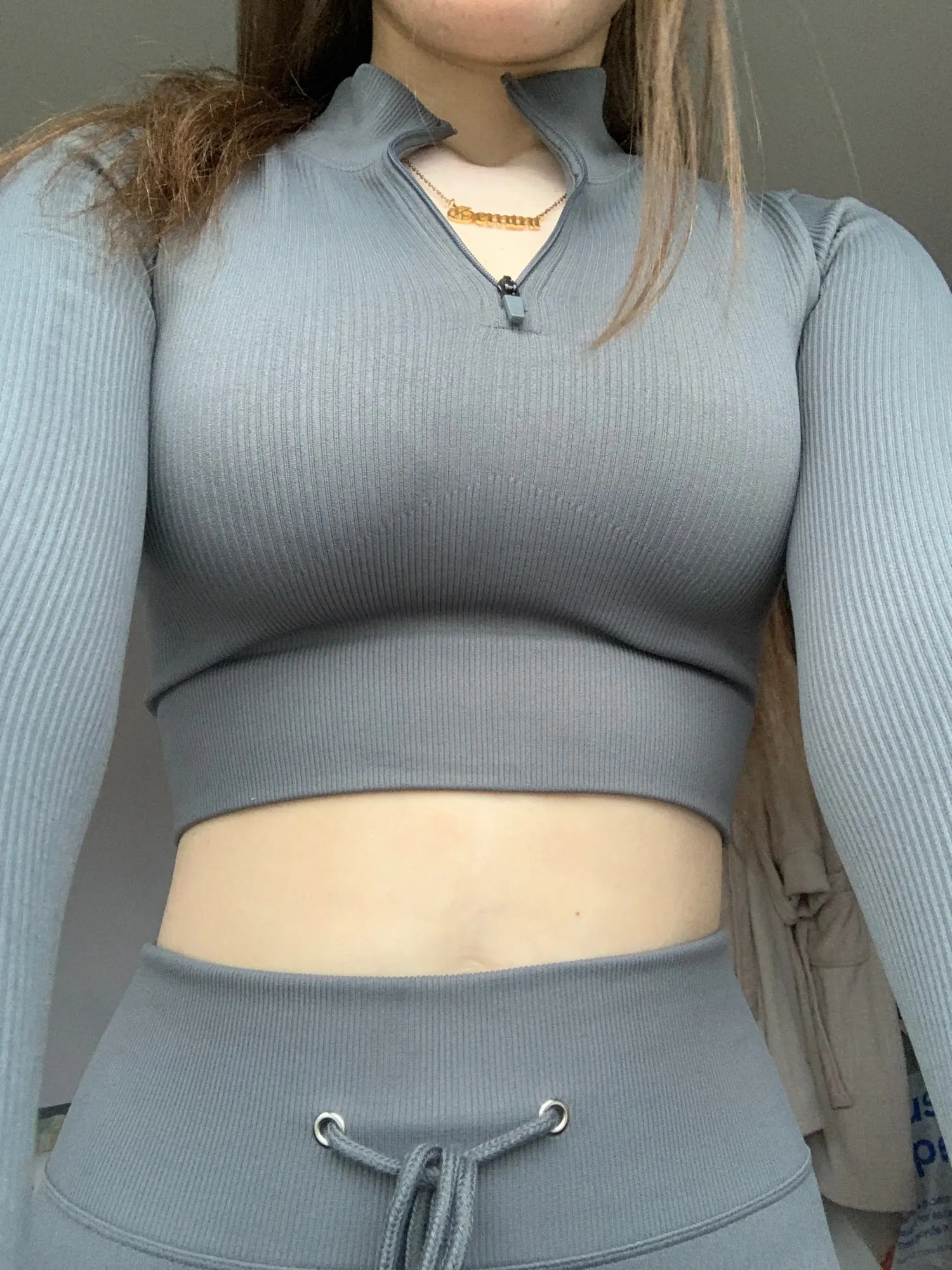 Dieses blickdichte, zweiteilige Outfit mit Reißverschluss hat eine bequeme Passform, die Ihnen uneingeschränkte Bewegungsfreiheit lässt und sich perfekt für das Fitnessstudio oder einfach zum Entspannen zu Hause eignet. Mit moderater Bauchkontrolle und hoher Taille, die die natürliche Form Ihres Körpers betont. Stilvolles und cooles bauchfreies Oberteil mit Reißverschluss vorne, Daumenlöchern und hohem Kragen. Sehen Sie bei Ihrem nächsten Einkauf, beim Binge-Watching oder beim Training fantastisch aus.