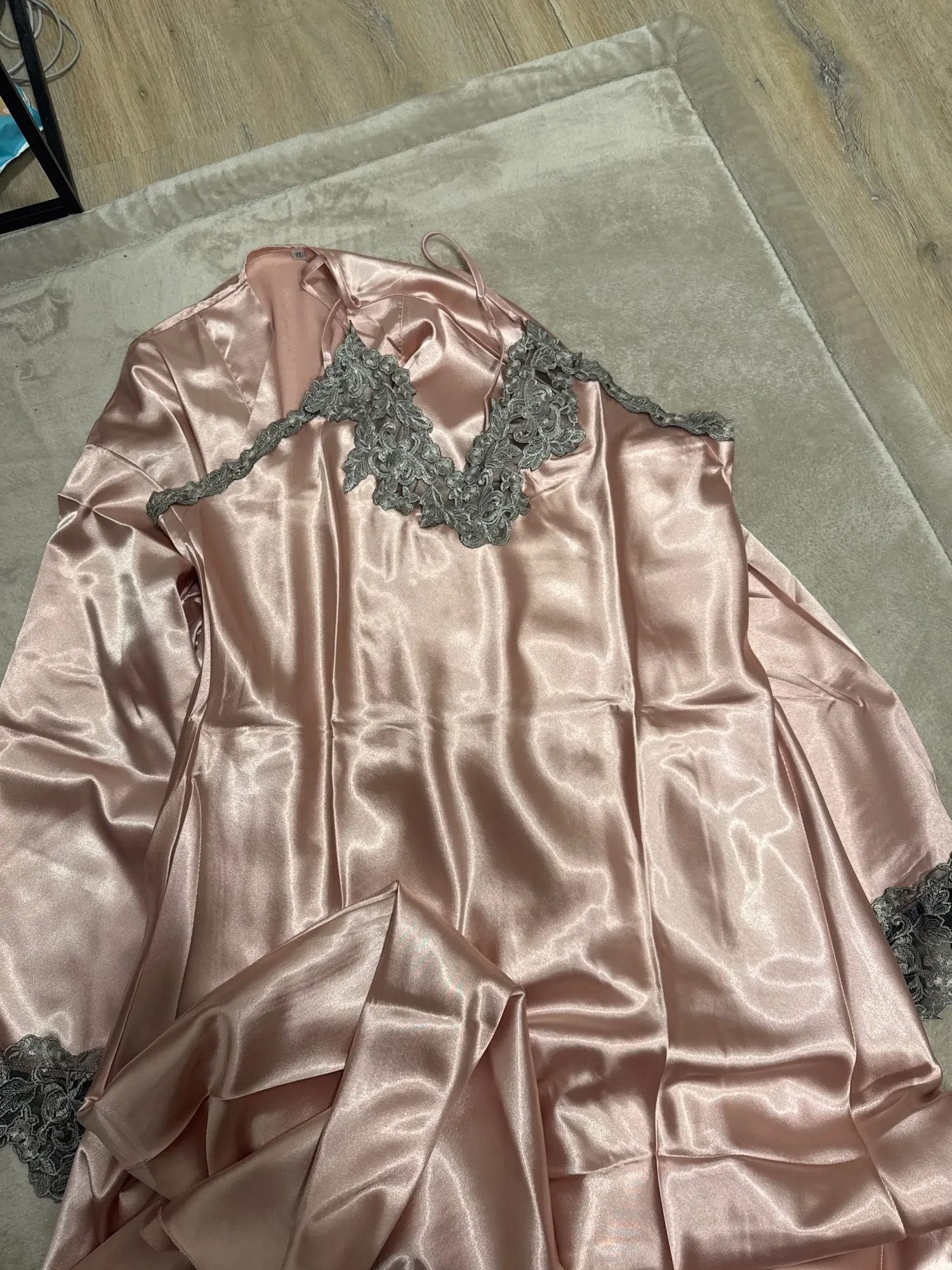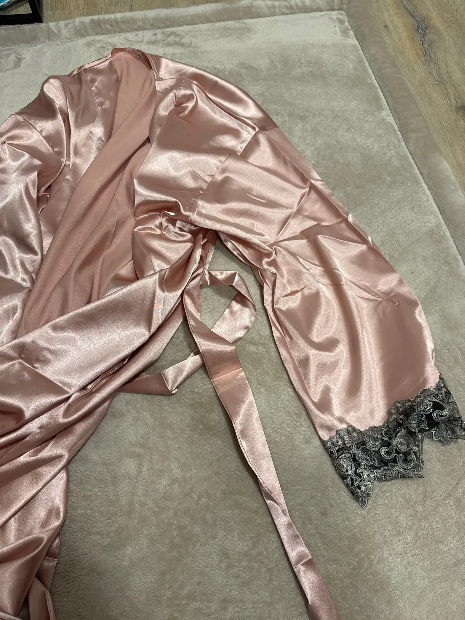 The fabric feels like silk so it doesn't look cheap. I am 157cm tall and weigh 53 kilograms, but overall I am quite tall. It doesn't stick to the bed but is longer than I thought. The dress fits perfectly around the waist and is just right. The robe can be adjusted because it ties at the waist with a belt and has inside tie.