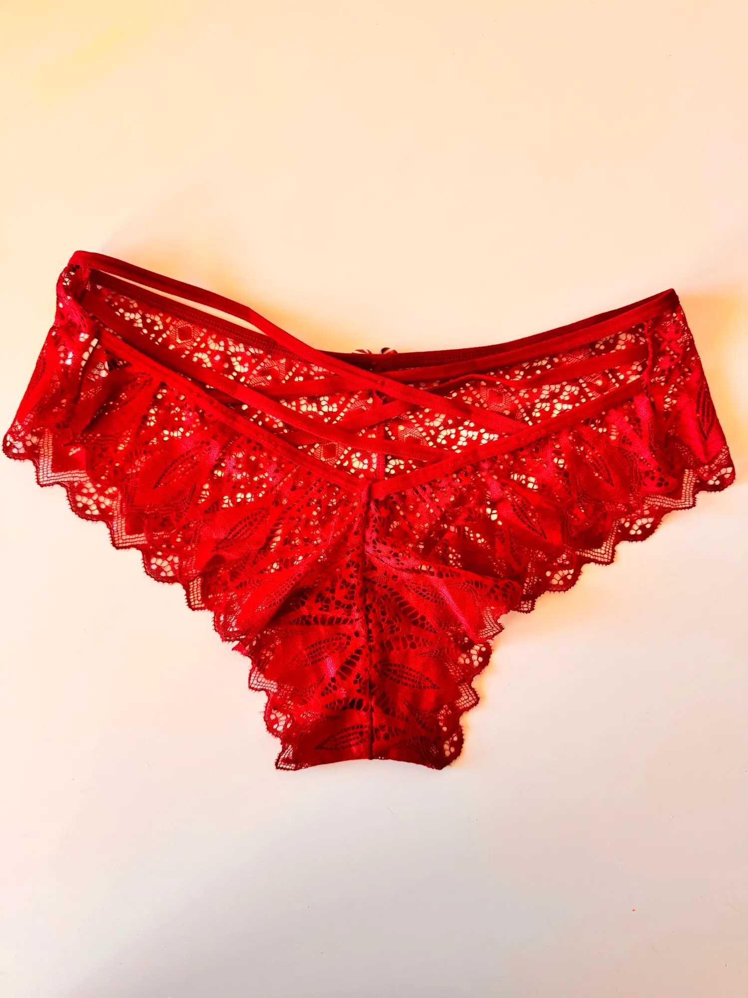 Atemberaubender und exklusiver, frecher Spitzen-String mit ausgeschnittener Rückseite und halbtransparentem Spitzenstoff mit überkreuzten Details auf der Rückseite, die diesem einzigartigen Slip Charme verleihen.